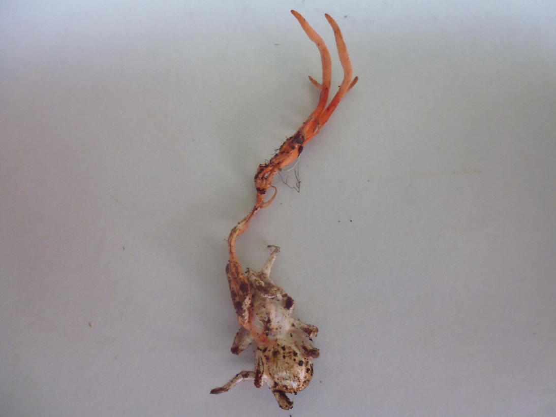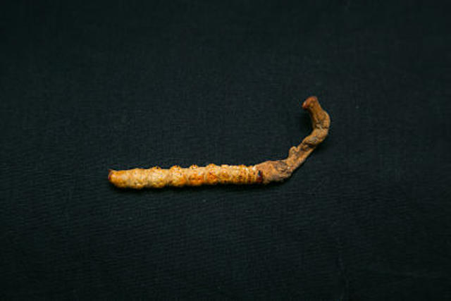 This fungus parasitizes larva of ghost moths and produces a fruiting body valued as an herbal remedy. The fungus penetrates the larva, growing and living inside and finally killing its host after it has burrowed beneath the ground.